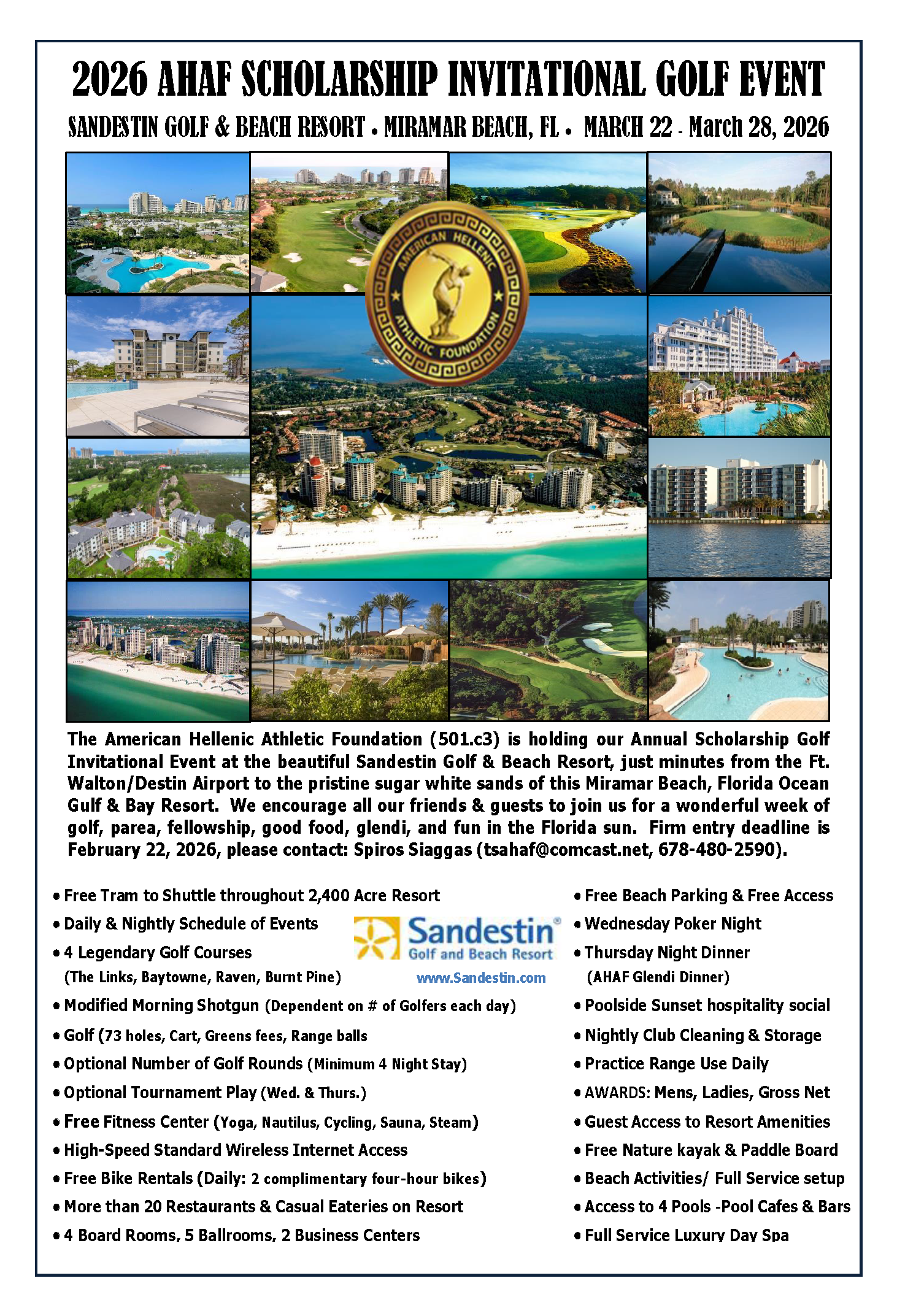 SANDESTIN GOLF & BEACH RESORT · MIRAMAR BEACH, FL · MARCH 22 - MARCH 28,2026 AHAF SCHOLARSHIP INVITATIONAL GOLF EVENT The American Hellenic Athletic Foundation (501.c3) is holding our Annual Scholarship Golf